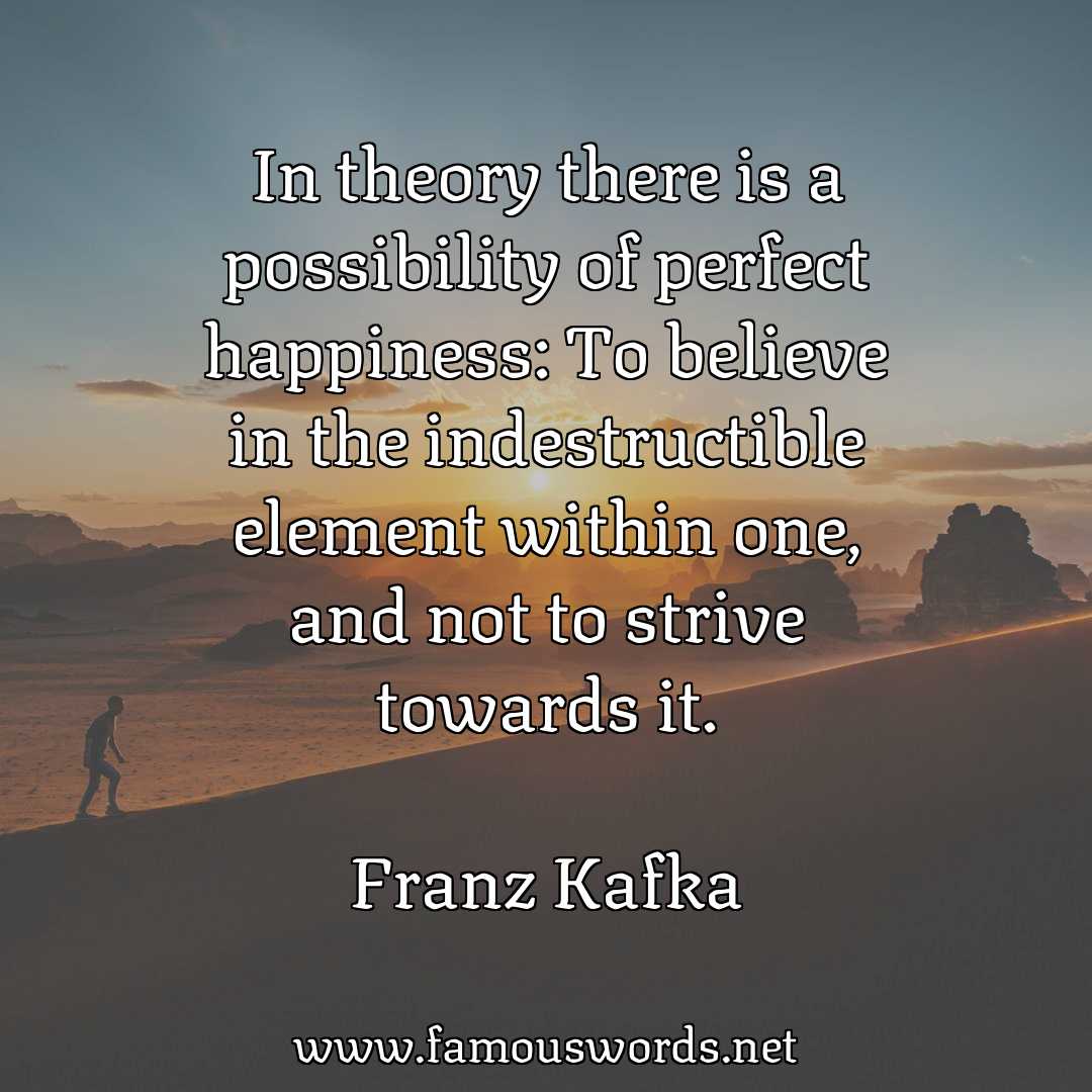 Today’s quote of the day is: “In theory there is a possibility of perfect happiness: To believe in the indestructible element within one, and not to strive towards it.” (Franz Kafka)