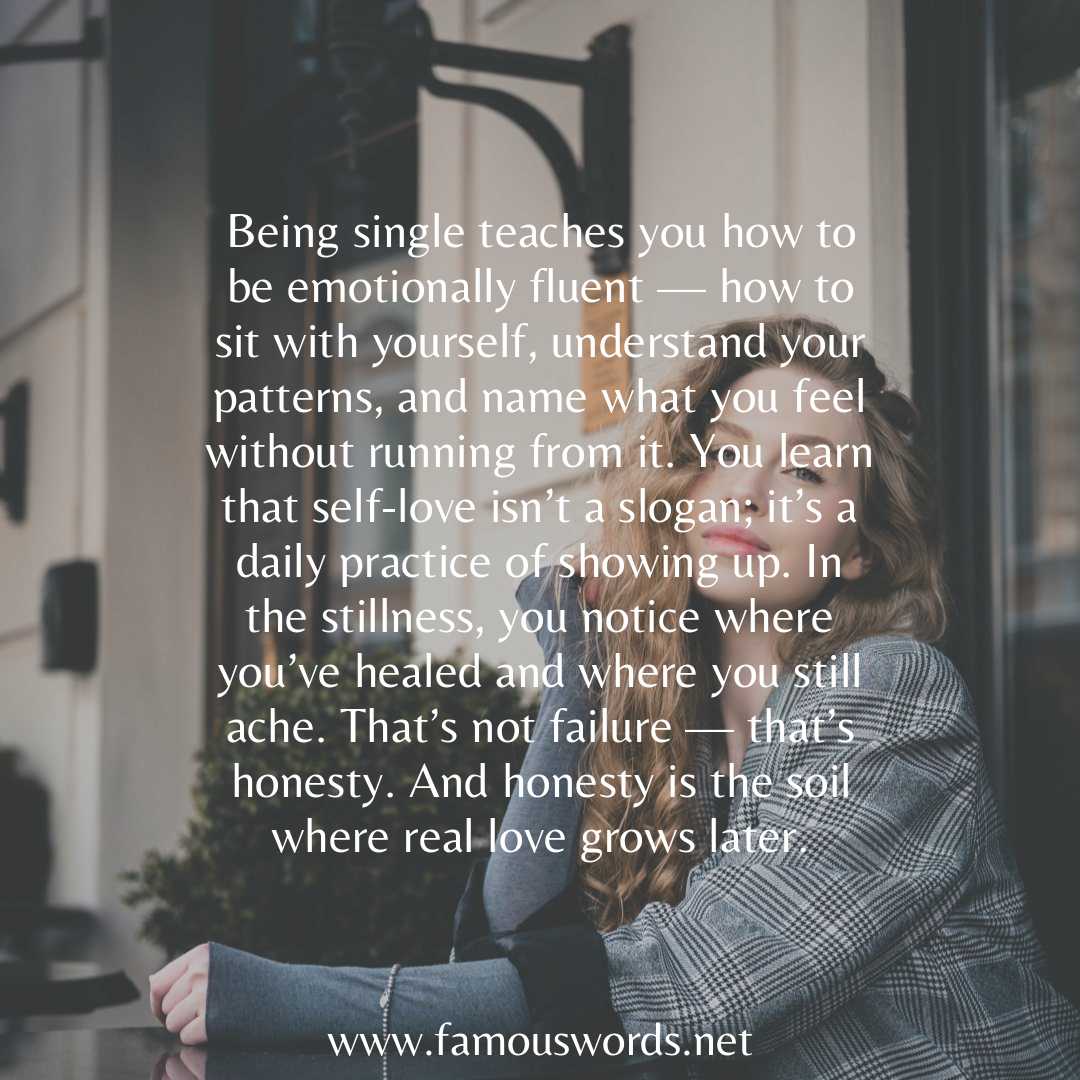 Today’s saying of the day is: “Being single teaches you how to be emotionally fluent — how to sit with yourself, understand your patterns, and name what you feel without running from it. You learn that self-love isn’t a slogan; it’s a daily practice of showing up. In the stillness, you notice where you’ve healed and where you still ache. That’s not failure — that’s honesty. And honesty is the soil where real love grows later.”