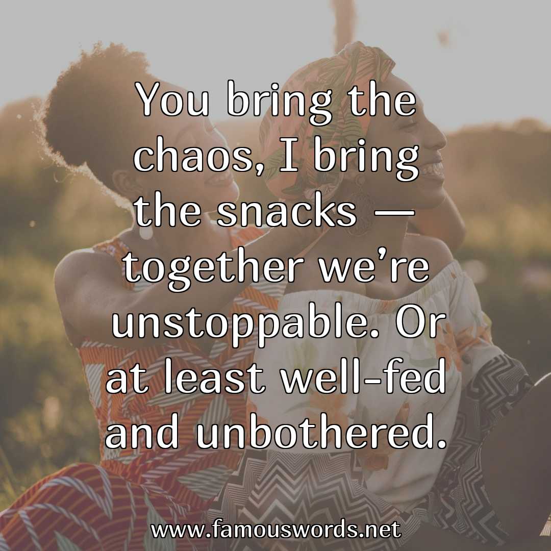The saying of the day is: “You bring the chaos, I bring the snacks — together we’re unstoppable. Or at least well-fed and unbothered.”
