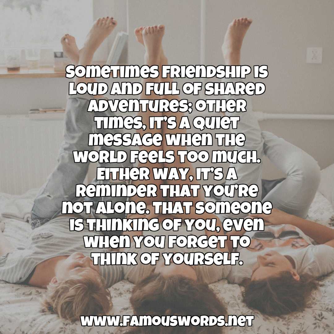 Today’s saying of the day is: “Sometimes friendship is loud and full of shared adventures; other times, it’s a quiet message when the world feels too much. Either way, it’s a reminder that you’re not alone. That someone is thinking of you, even when you forget to think of yourself.”