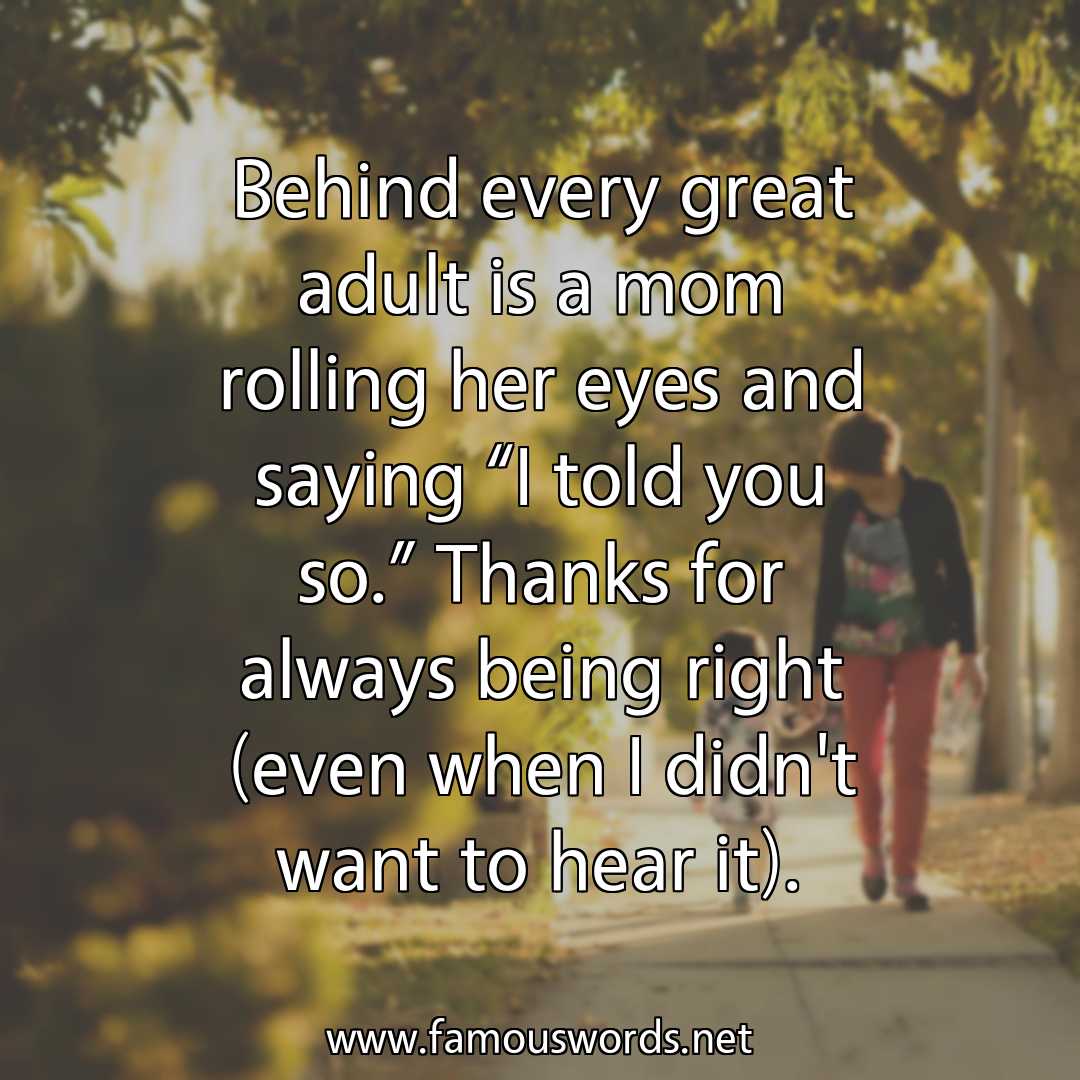 The saying of the day is: “Behind every great adult is a mom rolling her eyes and saying “I told you so.” Thanks for always being right (even when I didn’t want to hear it).”