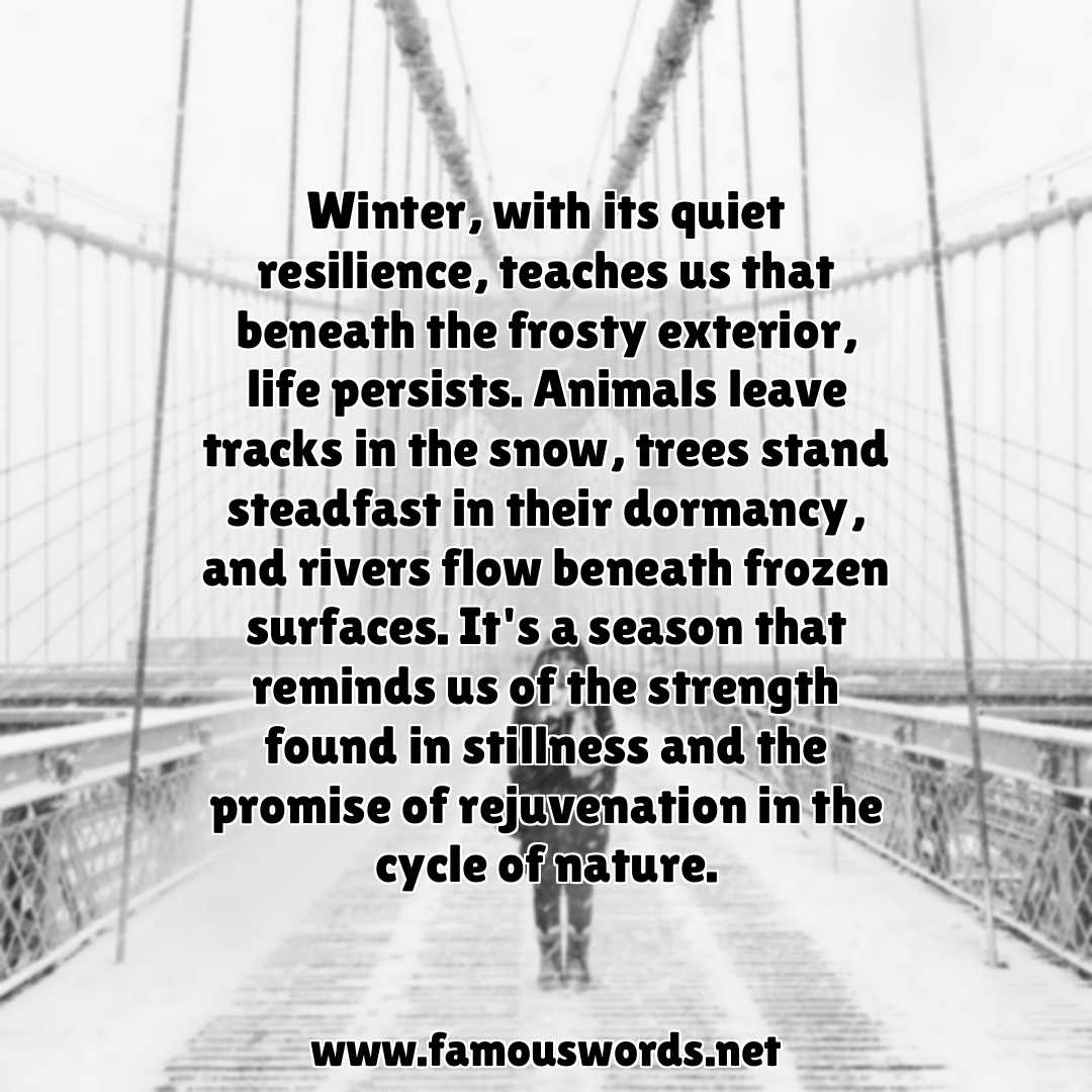 Today’s saying of the day is: “Winter, with its quiet resilience, teaches us that beneath the frosty exterior, life persists. Animals leave tracks in the snow, trees stand steadfast in their dormancy, and rivers flow beneath frozen surfaces. It’s a season that reminds us of the strength found in stillness and the promise of rejuvenation in the cycle of nature.”